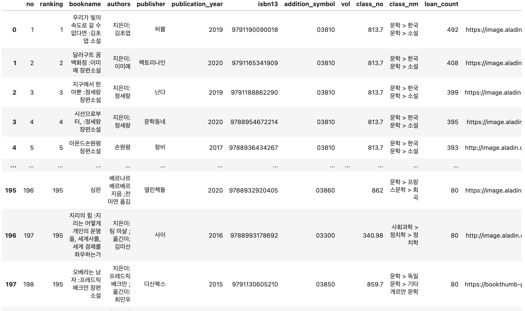 url = "http://data4library.kr/api/loanItemSrch?authKey=[발급키 입력]&age=20&startDt=2021-04-01&endDt=2021-04-30&format=json"