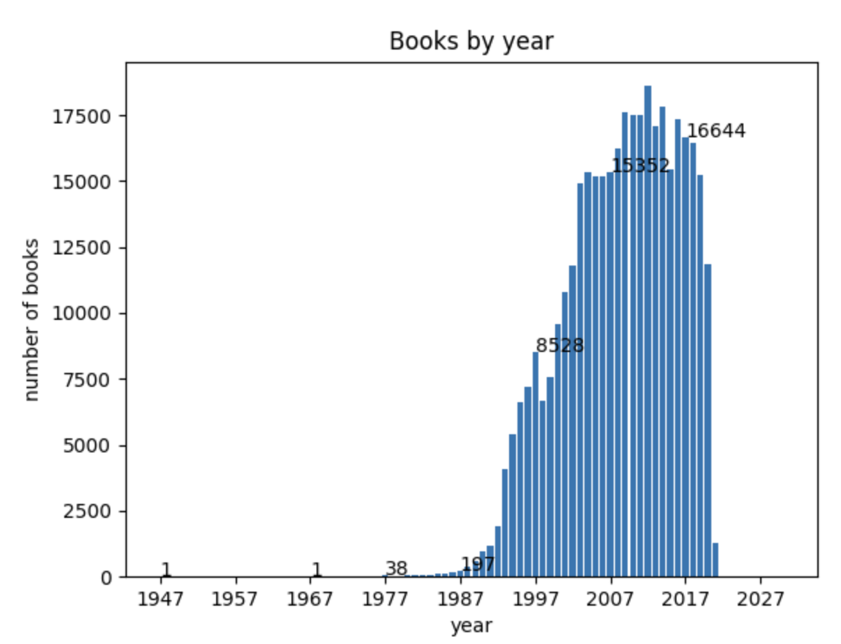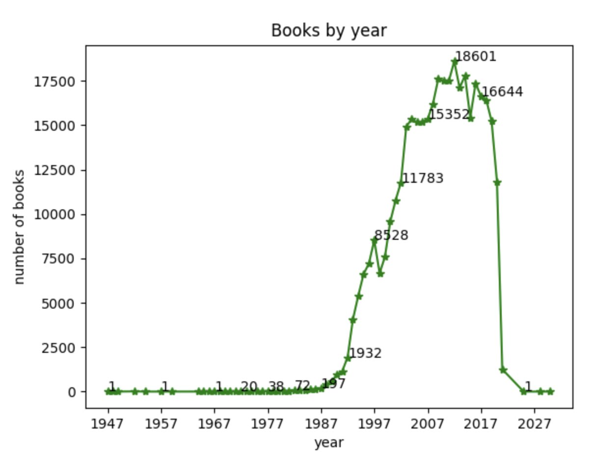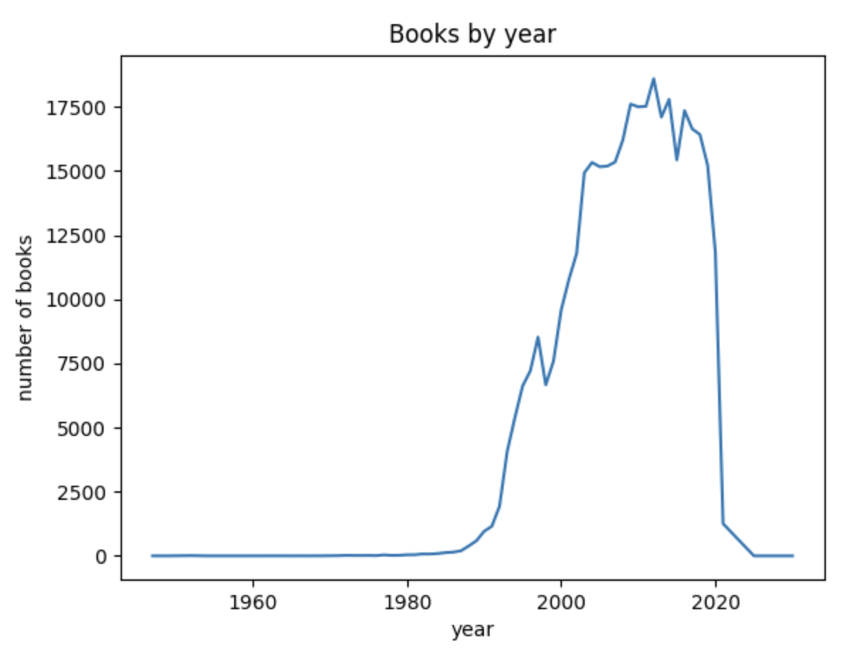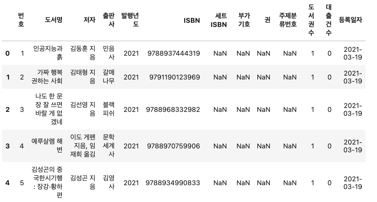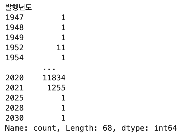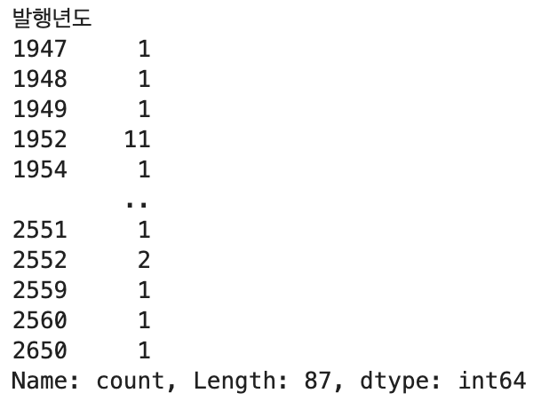 출력결과를 봤더니, 앞으로 발행예정일 도서들이 대출이 되었다고 나온다. 즉, 잘못된 데이터가 있다는 소리다. 하여 해당 데이터를 제거하기 위해 발행년도(index)가 2030년 이하인 데이터만 추려보자.
