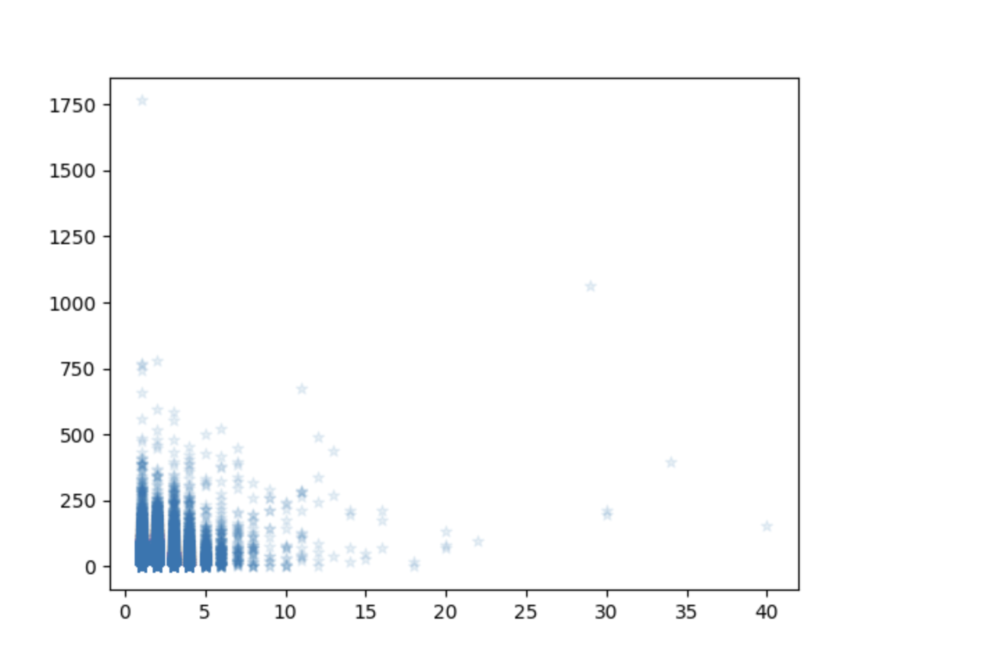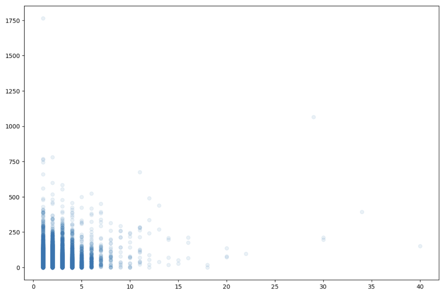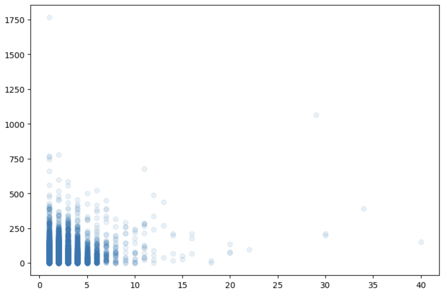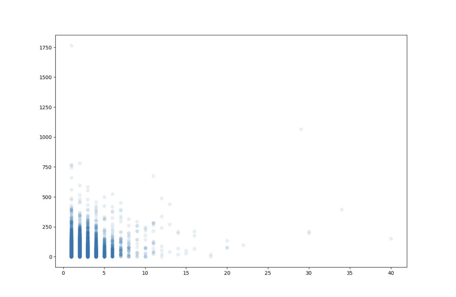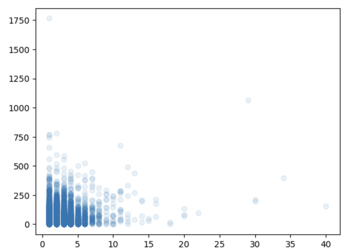 저번시간에 그렸던 산점도 그래프를 우선적으로 그려보자, 저번 시간 복습 겸 떠올리자면 matplotlib.pyplot 모듈을 호출하여 scatter() 함수로 그리면된다. 이때, 우리는 도서권수를 x축으로 하고, 대출건수를 y축으로 하여 그래프를 그려보자. 그리고, alpha 값을 0.1로 하여 데이터의 빈도를 투명도로 표시하여 그려보자.